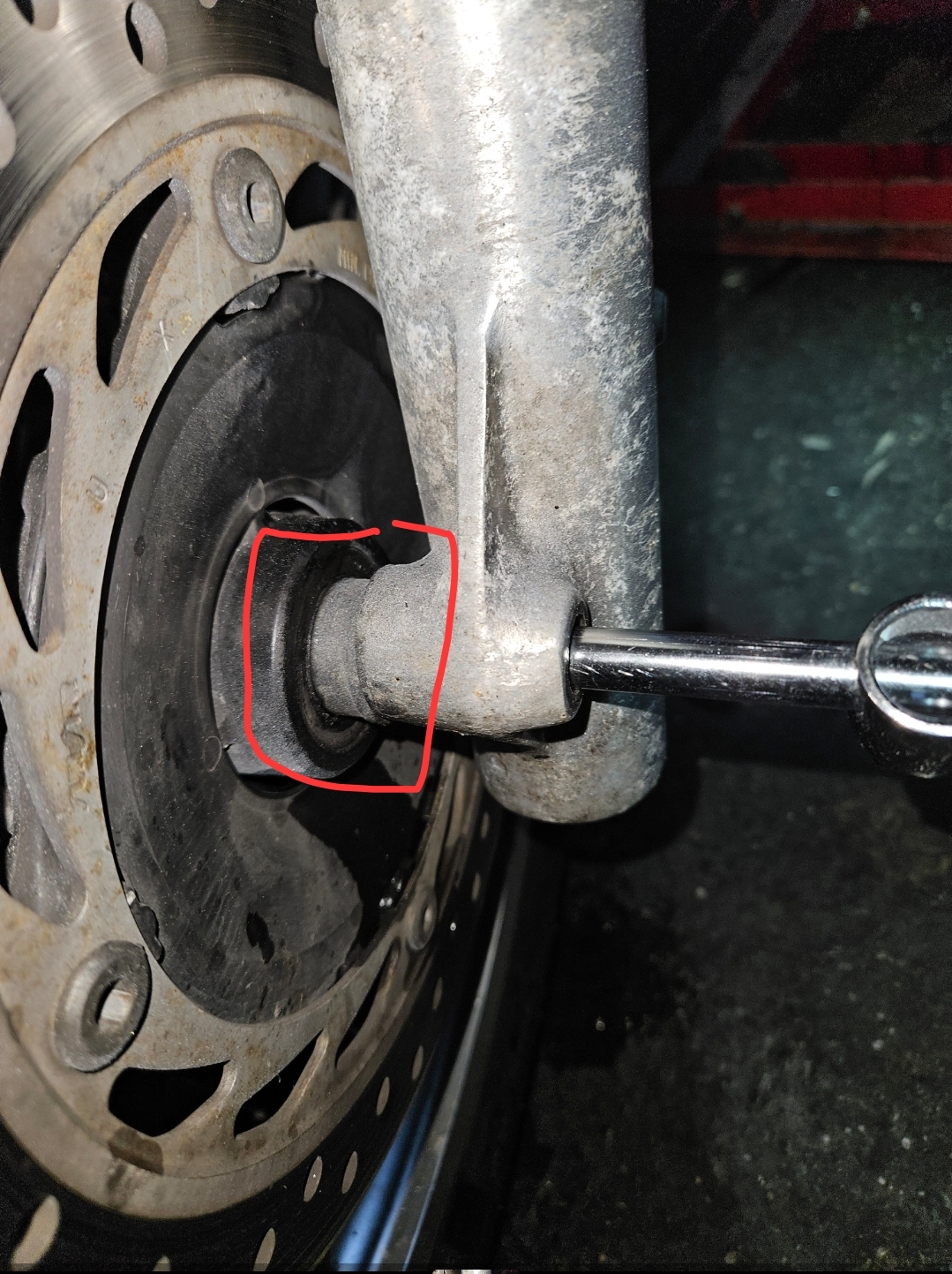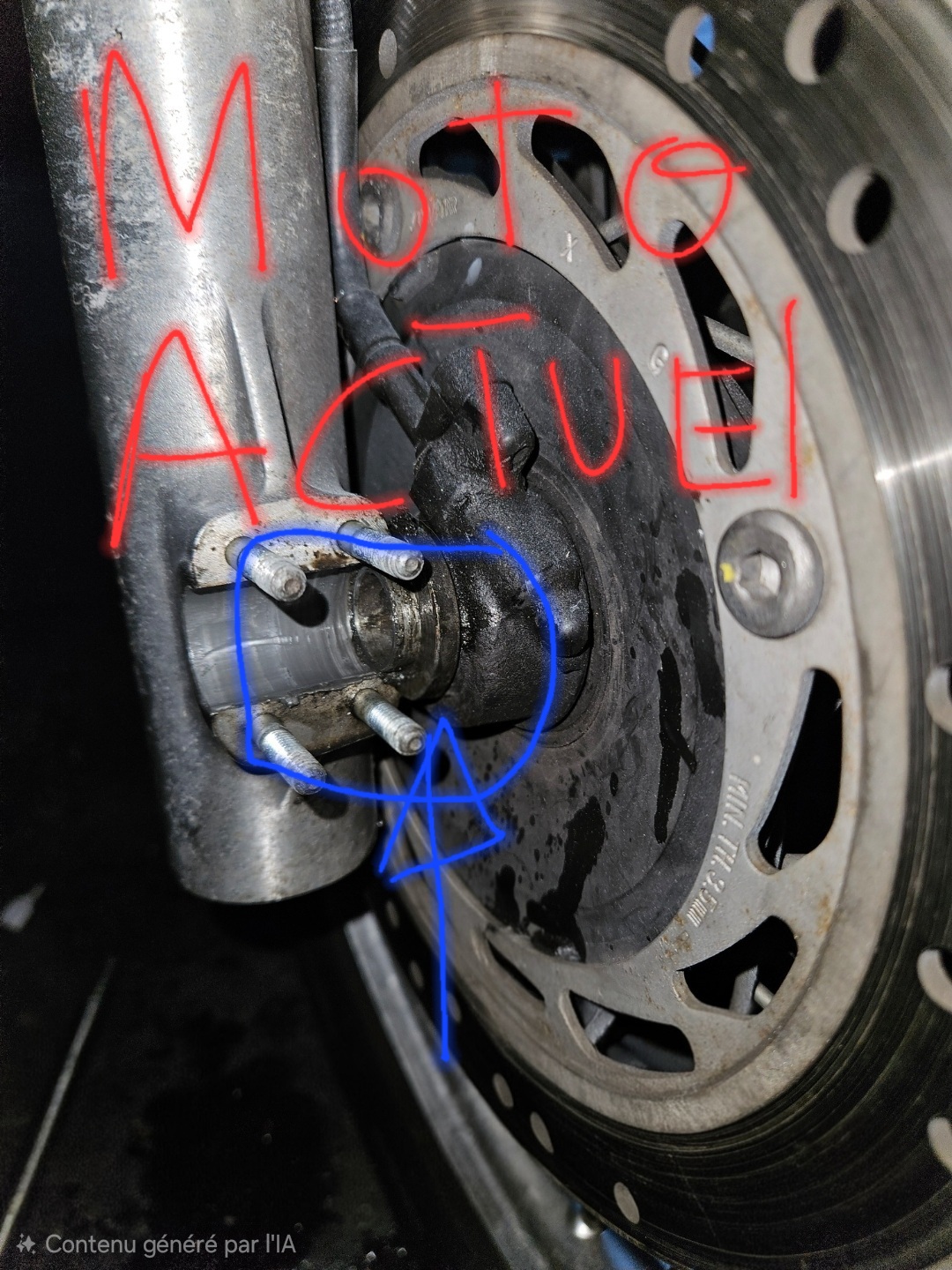 1. J'ai acheté la moto avec cet axe de roue avant qui ne se vise pas jusqu'au bout (voir photo de la meule a l'origine).