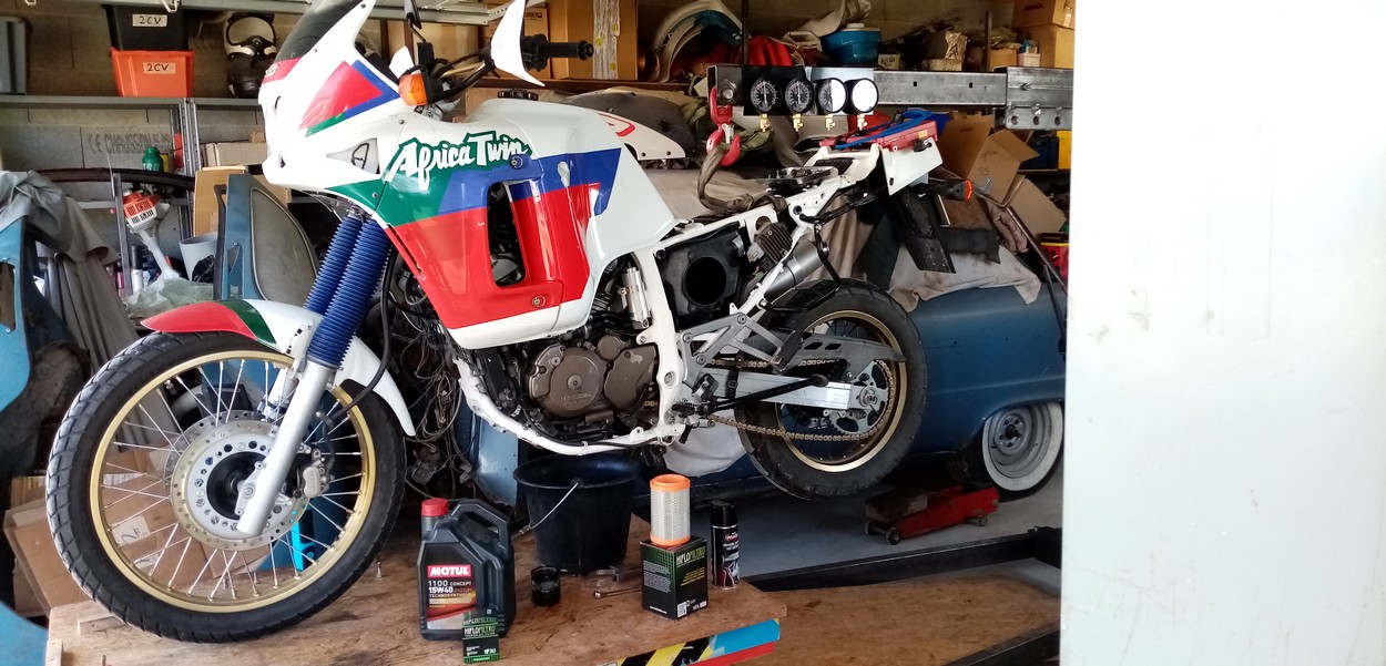 Depuis , l'Africa est repassée sur le billard pour une vidange + filtre de l'huile de remise en route (1000 bornes de rinçage ), inspections diverses et resserages .