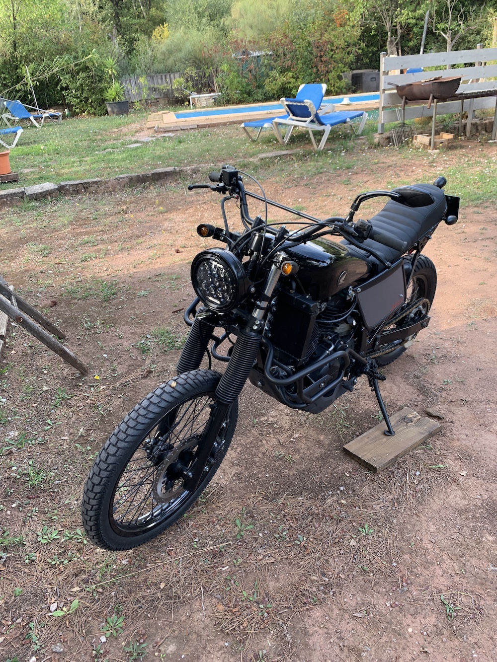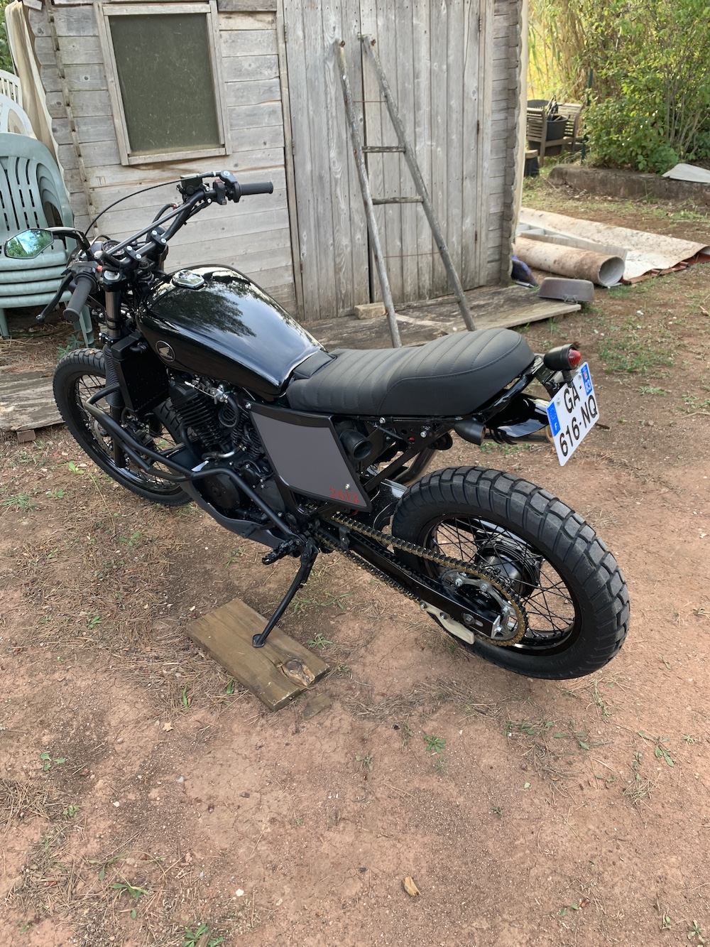 Le réservoir est en peinture depuis hier, et la selle en fabrication chez le sellier. Je vais rester sur le noir pour le réservoir. Je ferai une autre peinture plus tard. Mad Graphic, LE peintre de la région m'aurait pris plus de 500 € pour ce que je voulais; alors je vais attendre un peu.