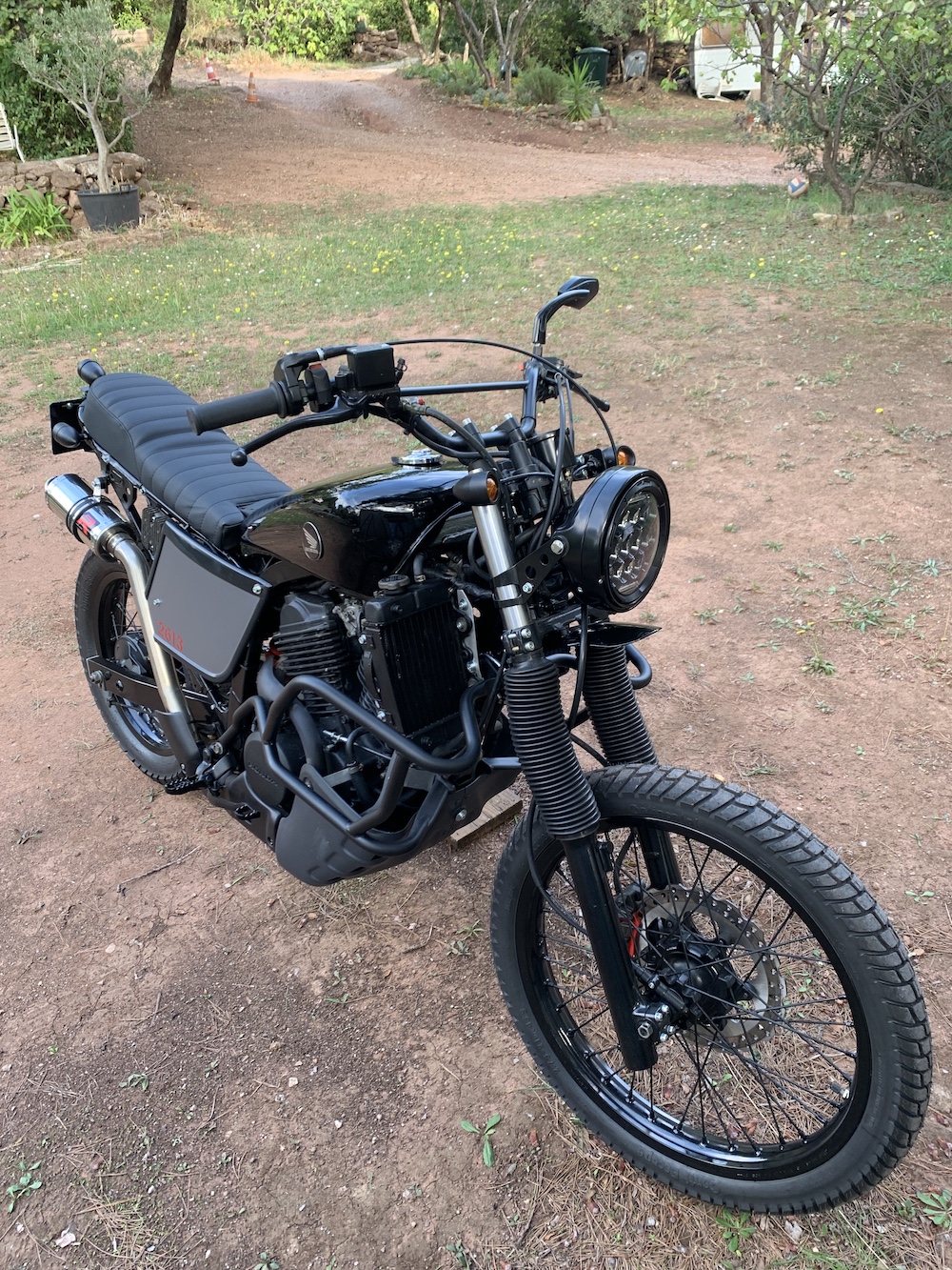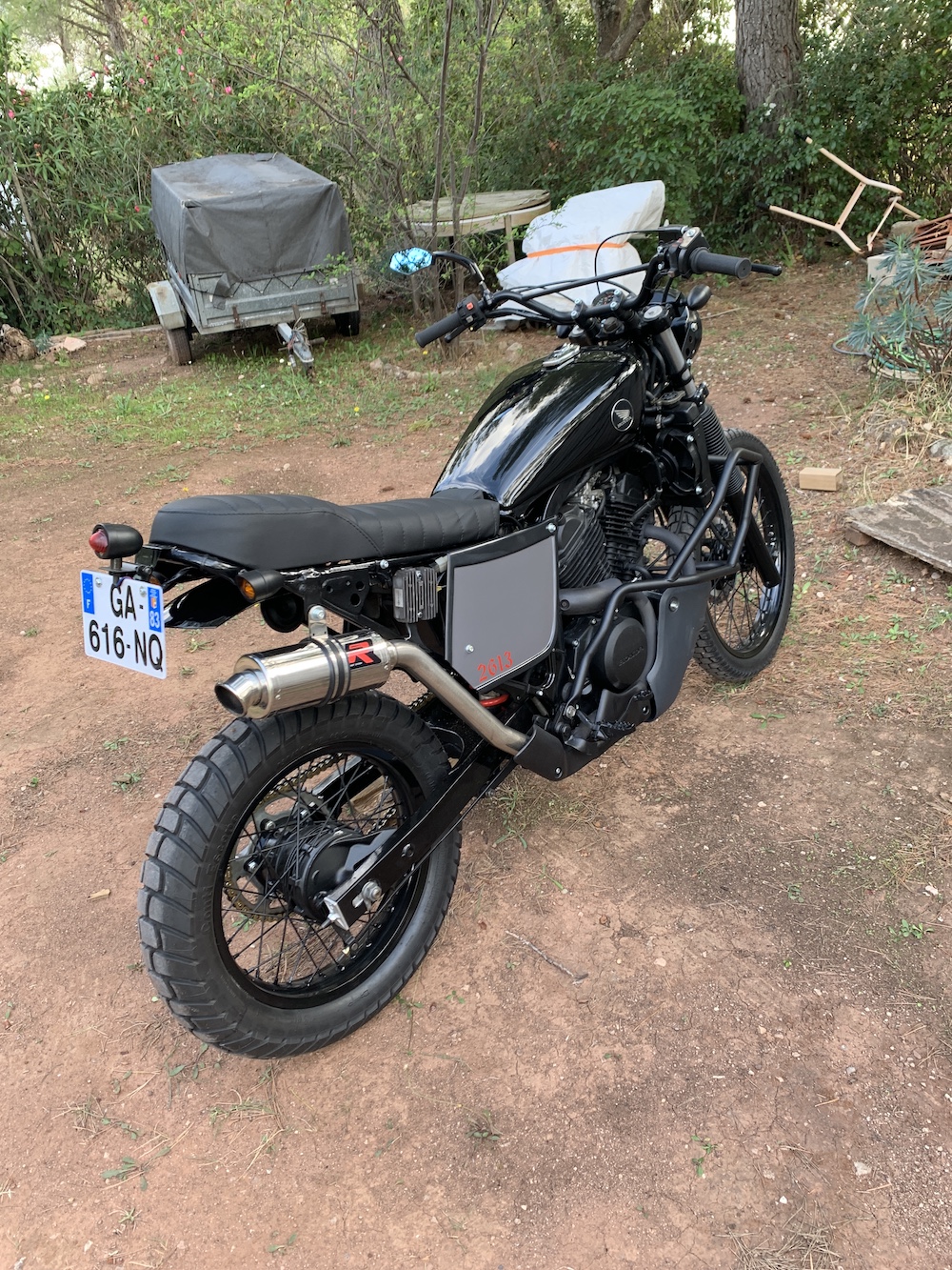 Je sais. Ce sont ceux d'origine, repeints, mais c'est pas le pied. En même temps, j'ai prévu un peu la petite gamelle dans un chemin. Le truc, bien sûr, c'est qu'il n'y a plus de carénage, donc ils ressemblent à la misère posée sur le monde.