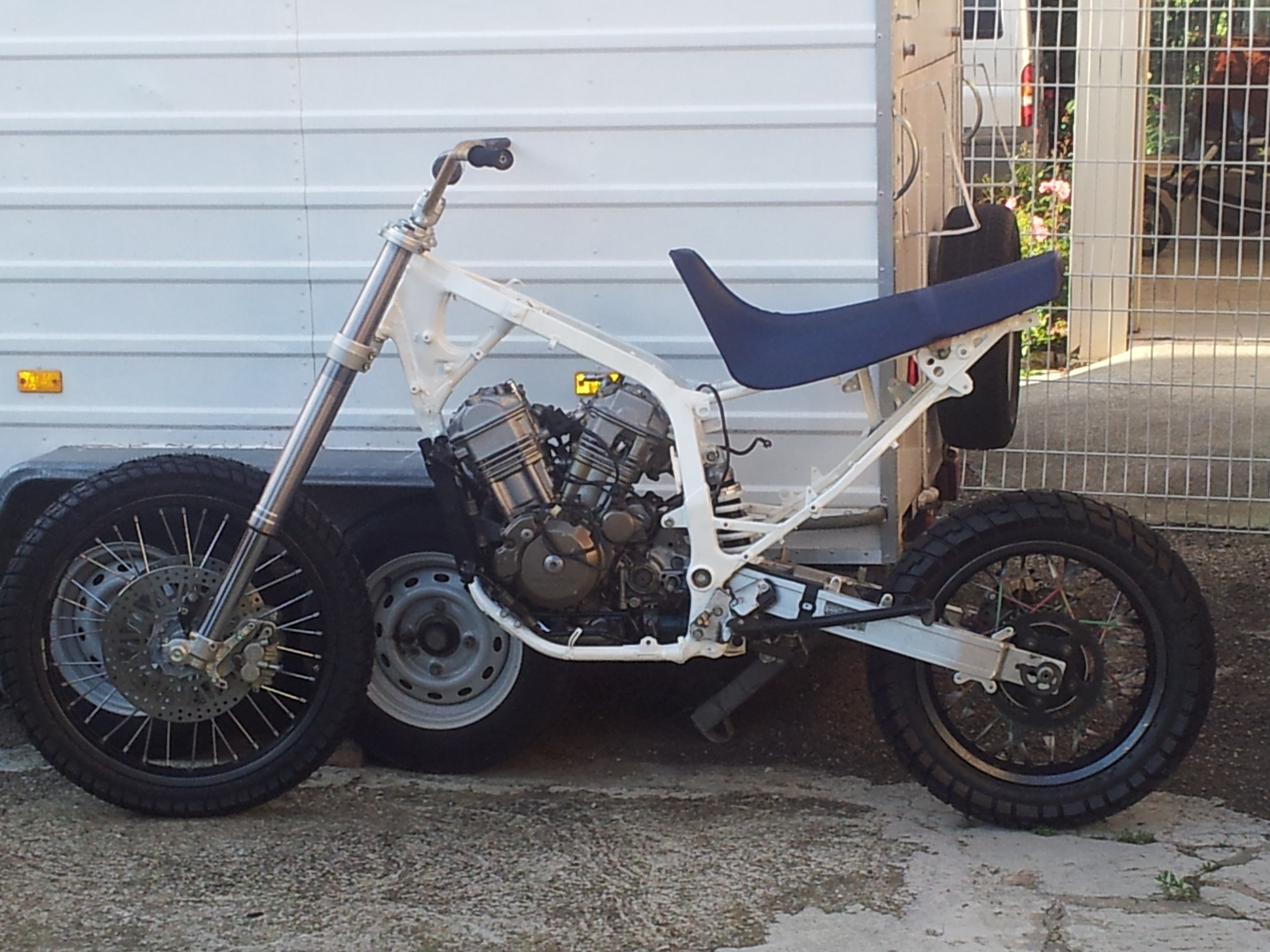 bon, le gars est un garagiste d'Ajaccio, qui avait monté ca sur un 1200 sporster, et qui avait greffé une roue de 950 duke à la place