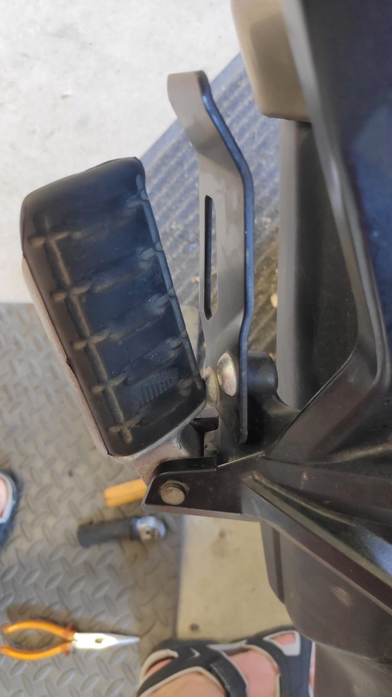- En cas de chute, c'est le bout du repose pied qui va prendre et faire levier contre une des deux vis de la petite plaque qui empêche le SDS de mettre sa semelle contre le silencieux (voir photo). Je me demande si en cas de chute, ça risque ou pas de casser le support. Car cette vis est sur une patte qui me semble plus fragile que le corps principal du support.