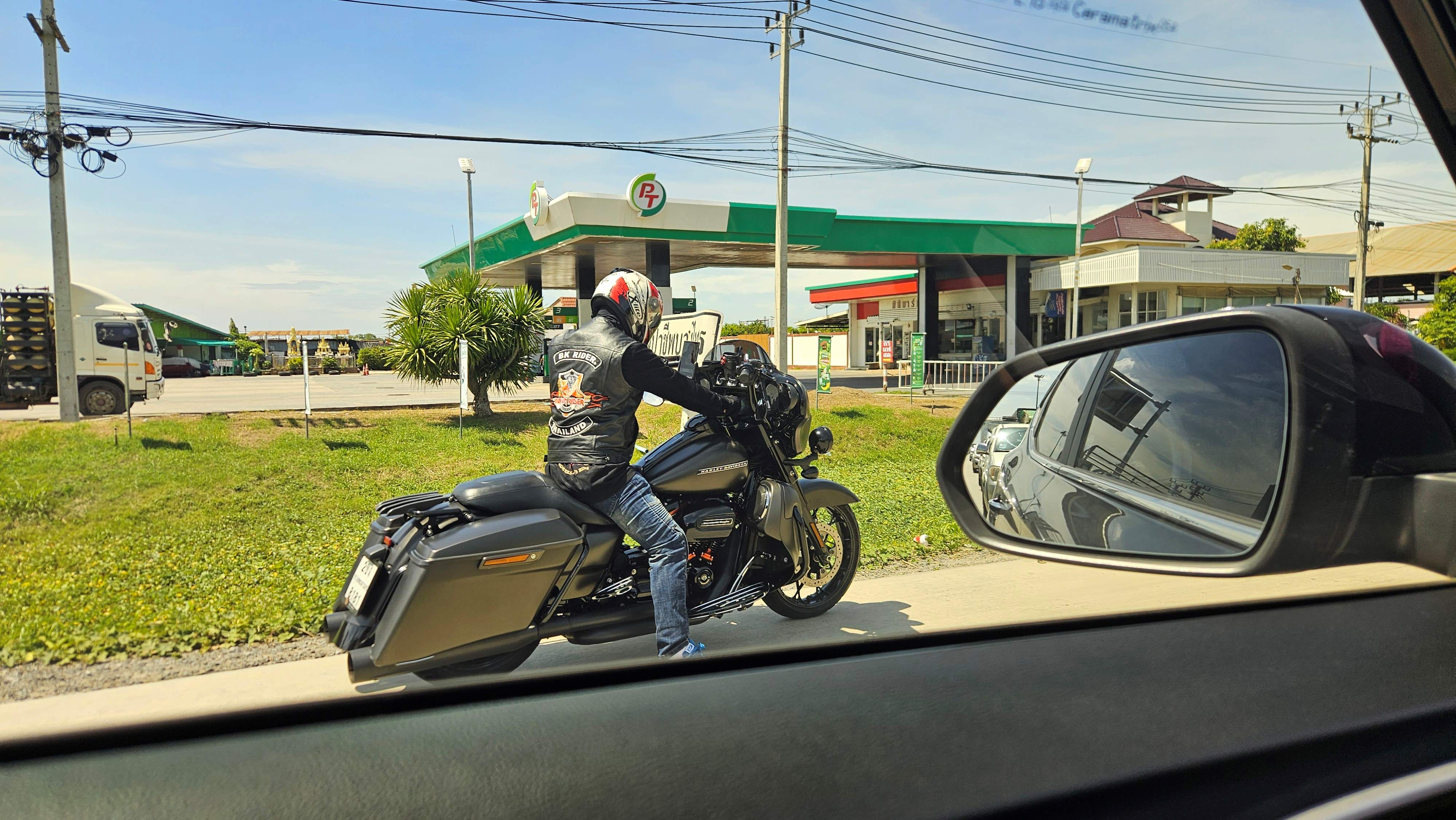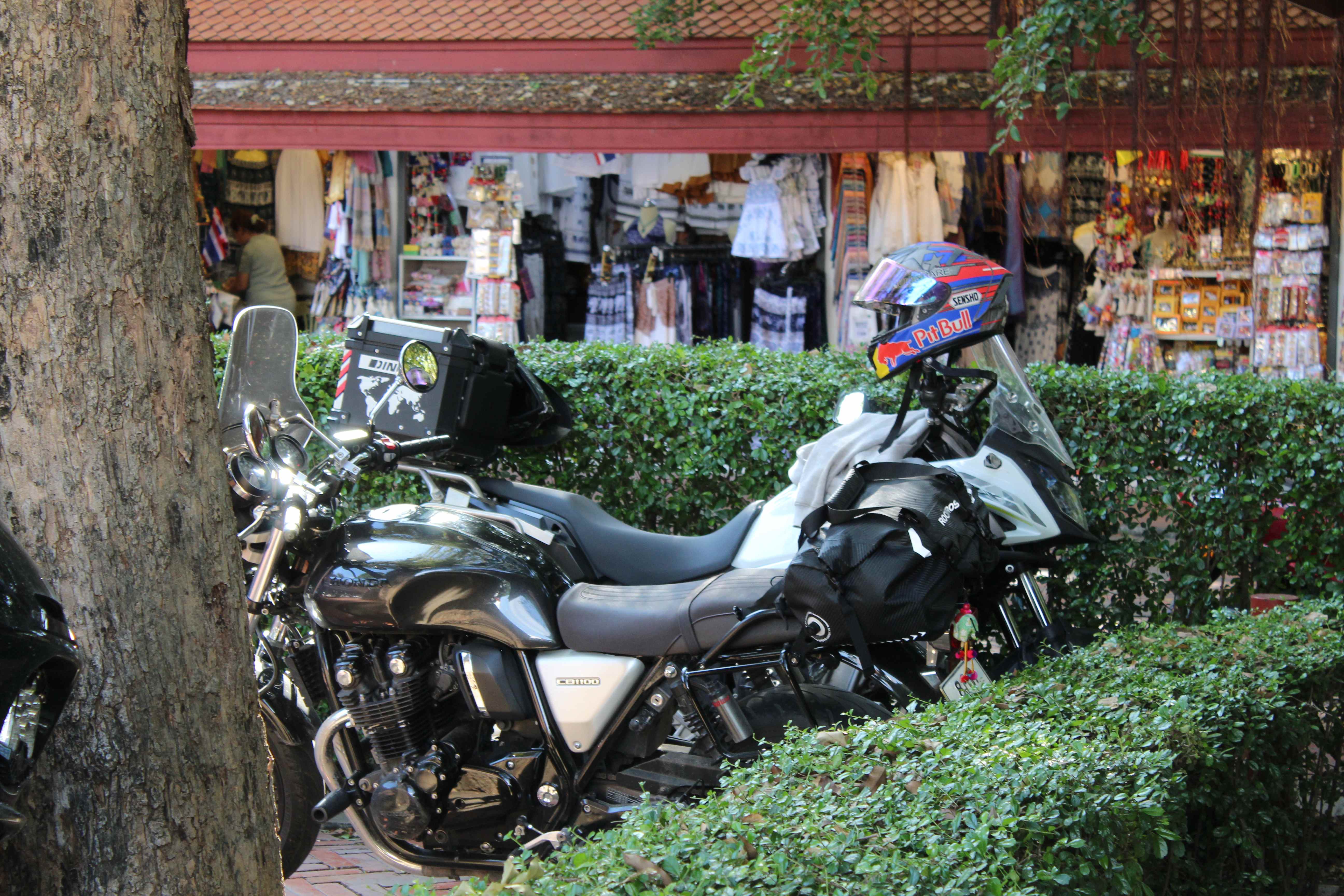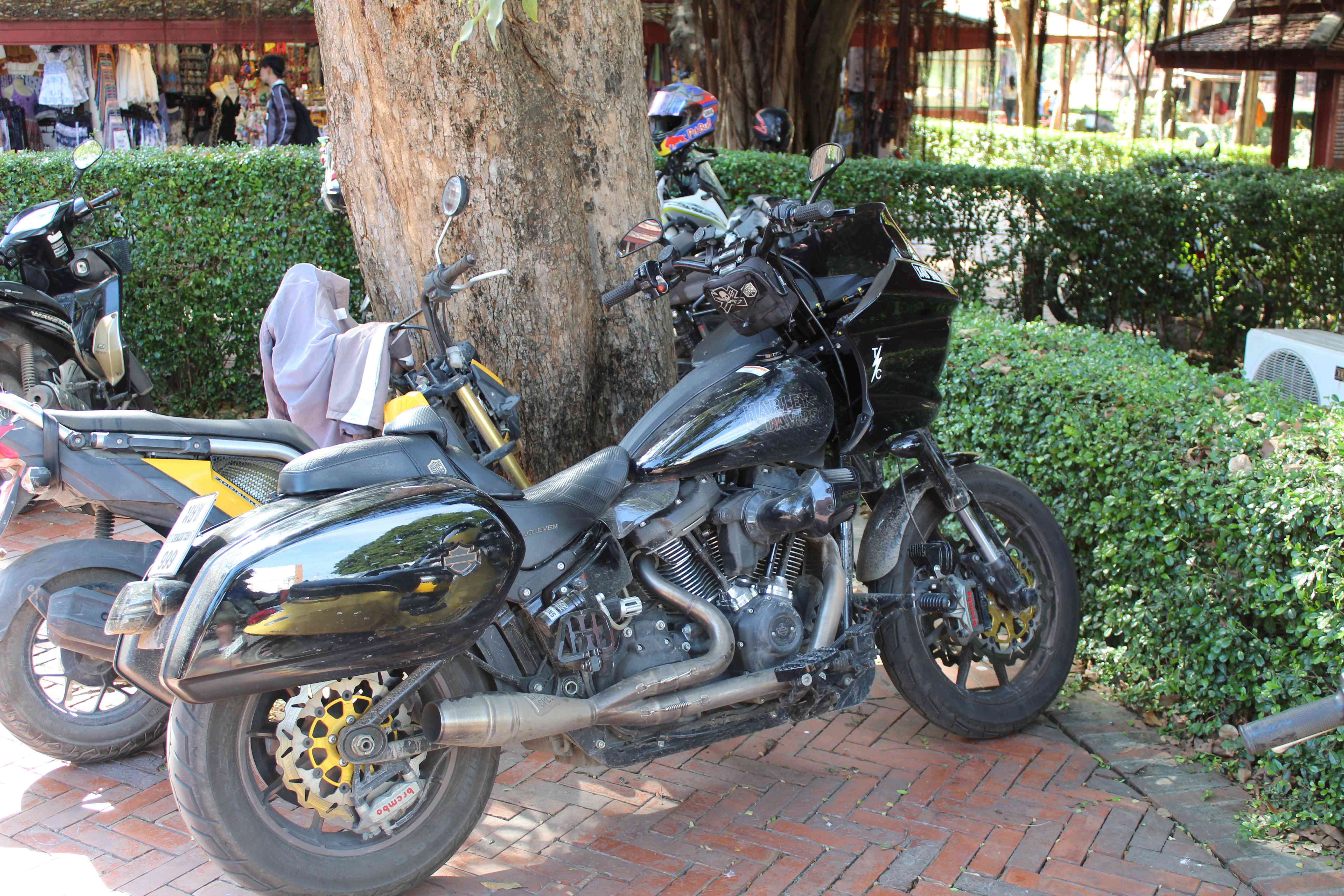 En voyageant vers le Nord, Chiang Mai et sa région, et l'Ouest du côté de Kanchanaburi et la rivière Kwai, on a croisé pas mal de groupes en Harley et aussi d'autres en mode "adventure", trails superéquipés. Tous bien équipés de la tête aux pieds, c'est normal me direz-vous, mais à 30°C et 90% de taux d'humidité, c'est une autre histoire !