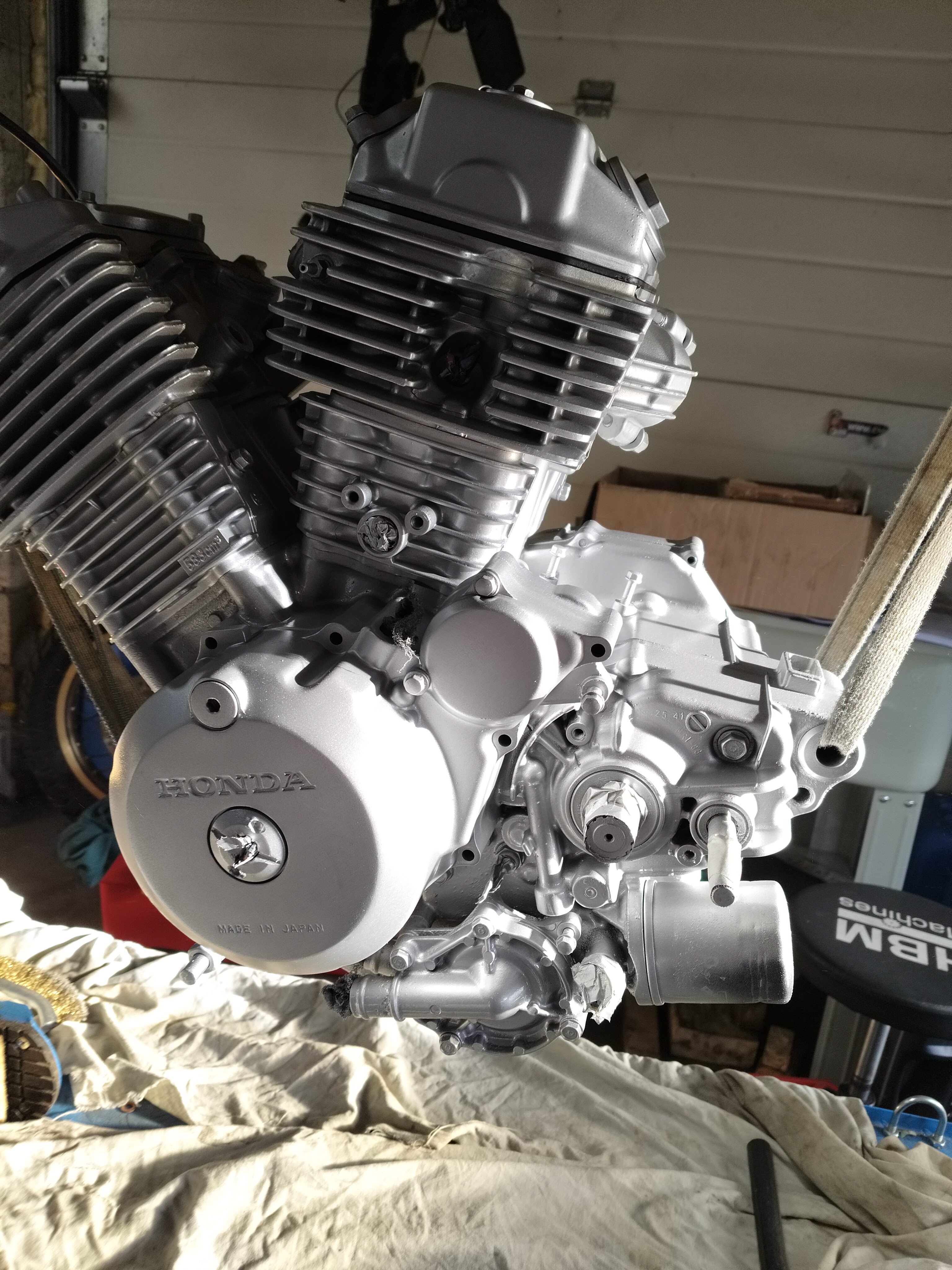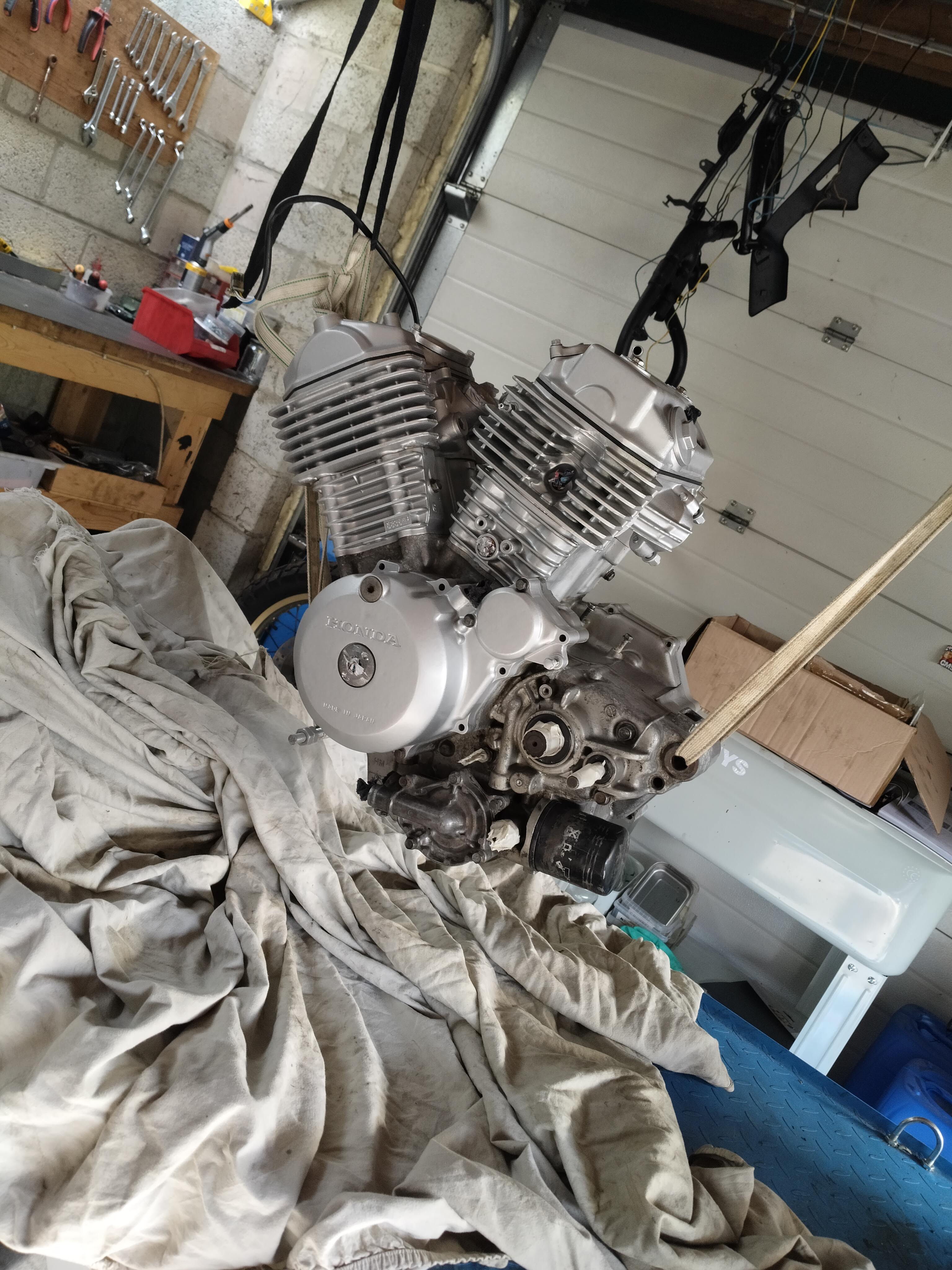 enfin le moteur est dans le cadre !!! quel enfin a remettre! on a fait par la gauche et sans les couvre soupapes et à plat...mais quand même une horreur.