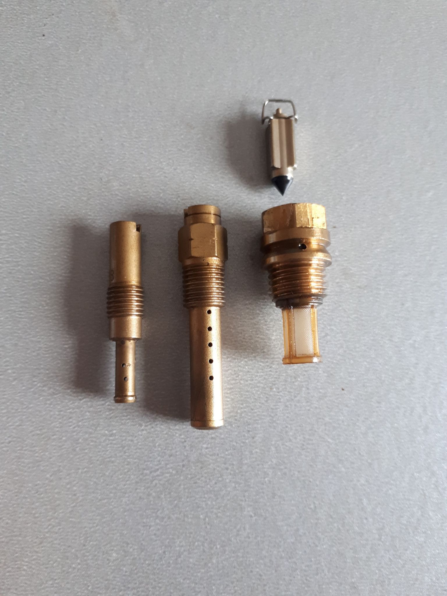 Le gicleur de ralenti, le gicleur principal, et le siège de pointeau (ils sont dans l'ordre sur la photo : Le filtre présent sur le siège du pointeau (a droite) se détache et faut le nettoyer (d'ailleurs faut tout nettoyer avant remontage de toute façon)