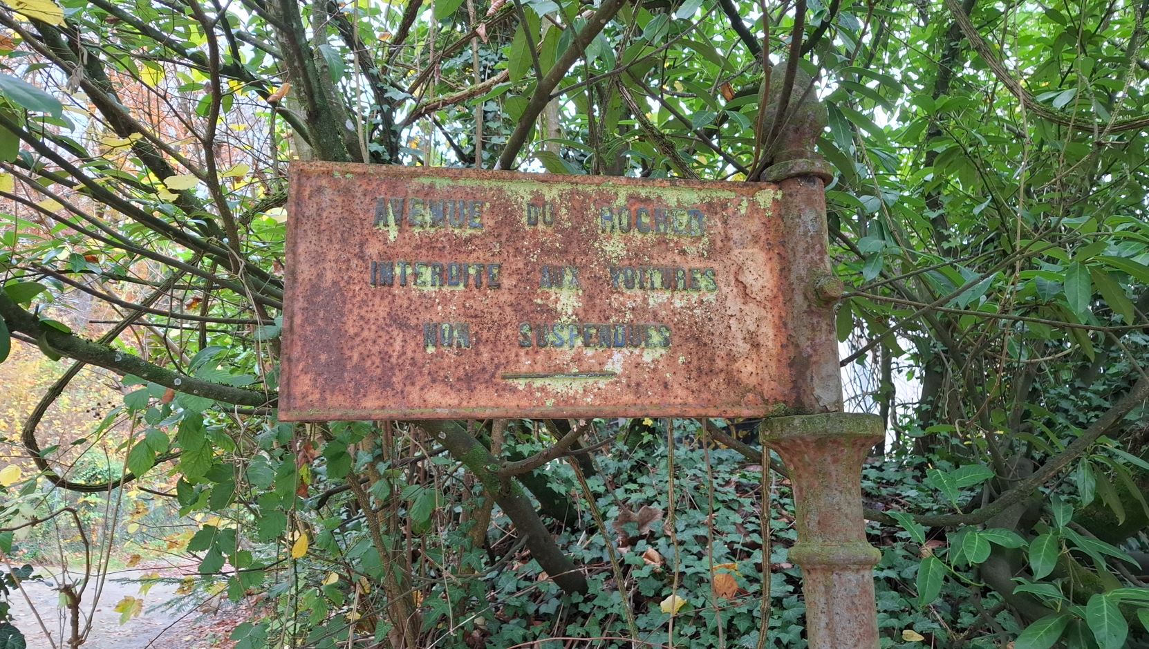 Un vieux panneau en fonte à l'entrée d'un chemin emprunté voulait en dire long sur le carrossage.