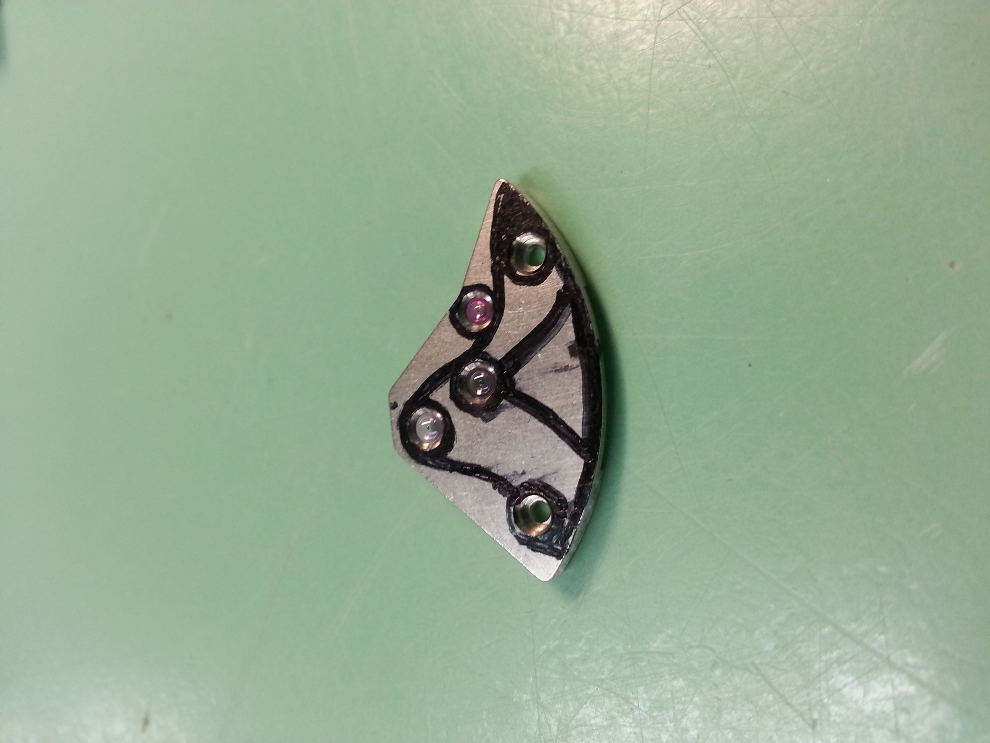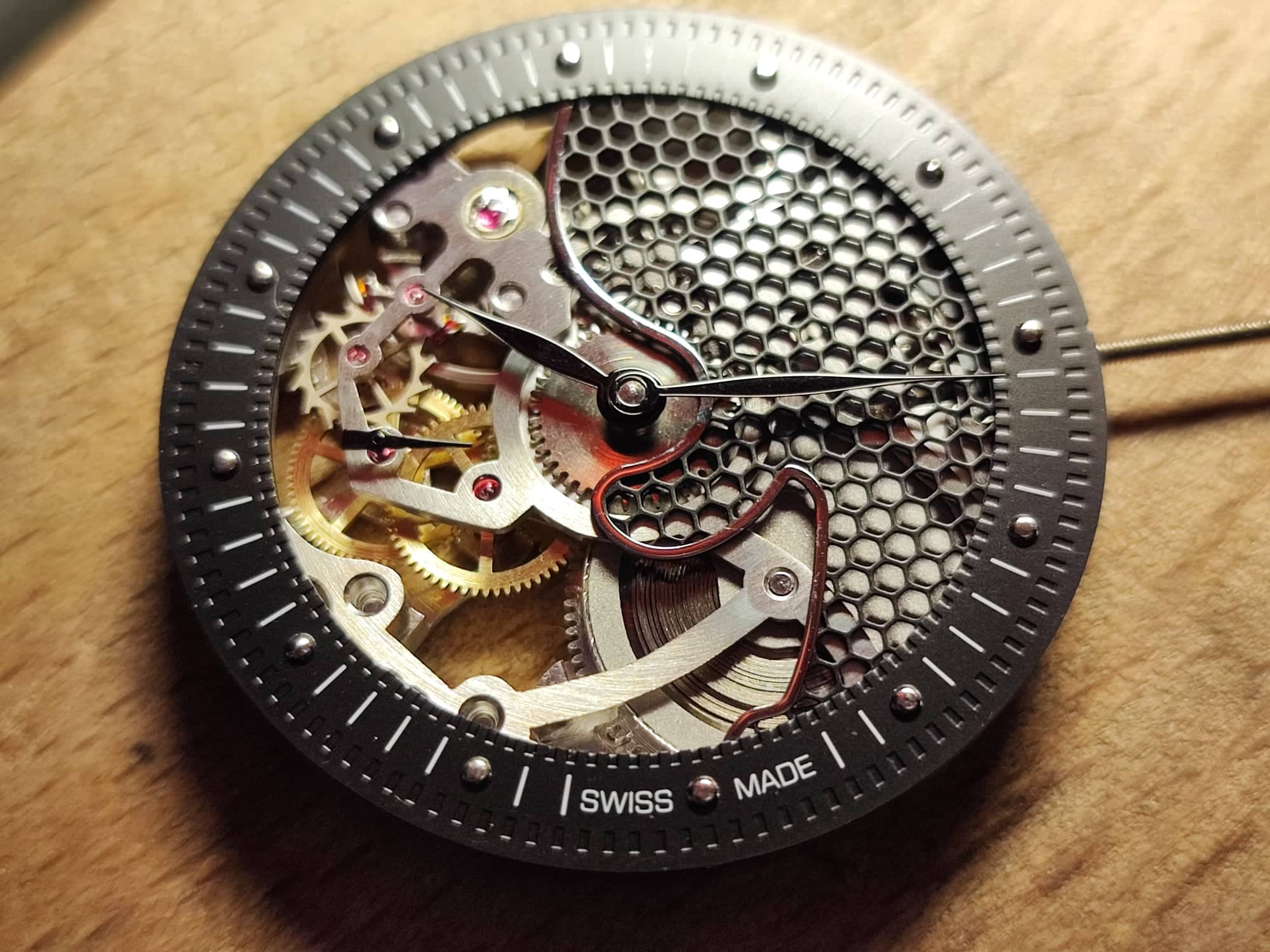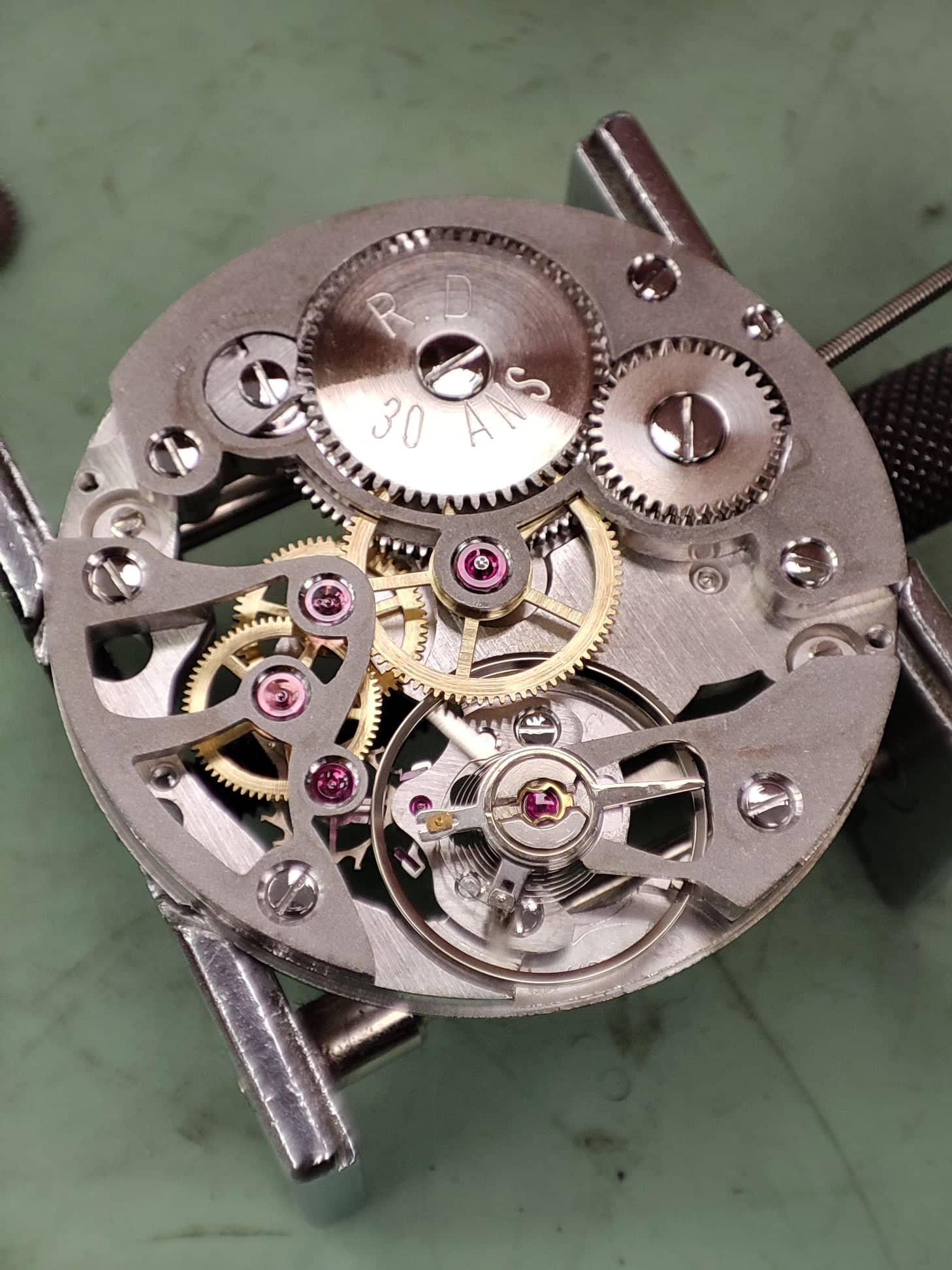 J'ai du démonter le mécanisme, faire la révision de celui-ci et changer des pièces si besoin pour une question de fiabilité ensuite j'ai commencé à faire mes dessins au marqueur sur le mécanisme. Du perçage, du sciage, du limage et les finitions sur chaque pièces que ce soit du polissage, du microbillage main, du rhodiage et toutes autres finitions…