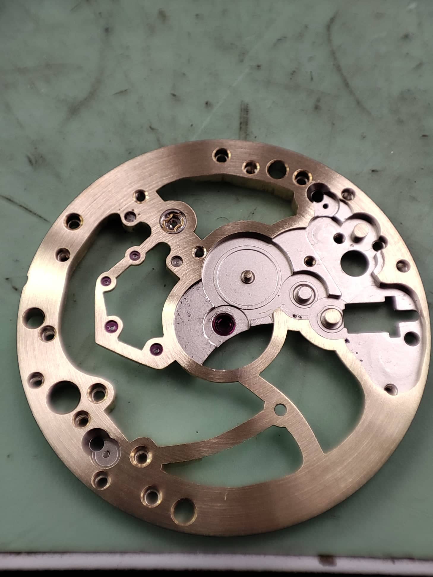 Mais vous pouvez vous référer à la première photo. Maintenant nous allons nous intéresser à la partie platine: La platine est la partie de la montre accueillant tout l'ensemble des pièces.
