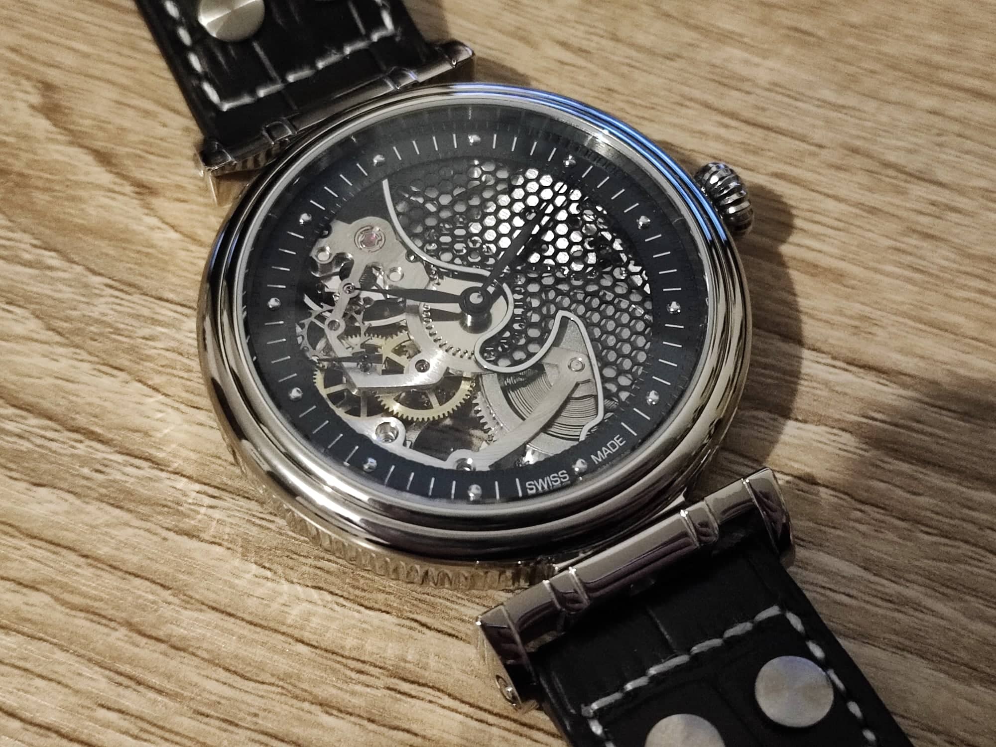 J'ai donc acheté la boite de montre, le cadran, le bracelet, les aiguilles et le mécanisme à remontage manuel sur lequel j'ai appris l'horlogerie. Le but dans cette personnalisation était d'en faire une montre "squelette".