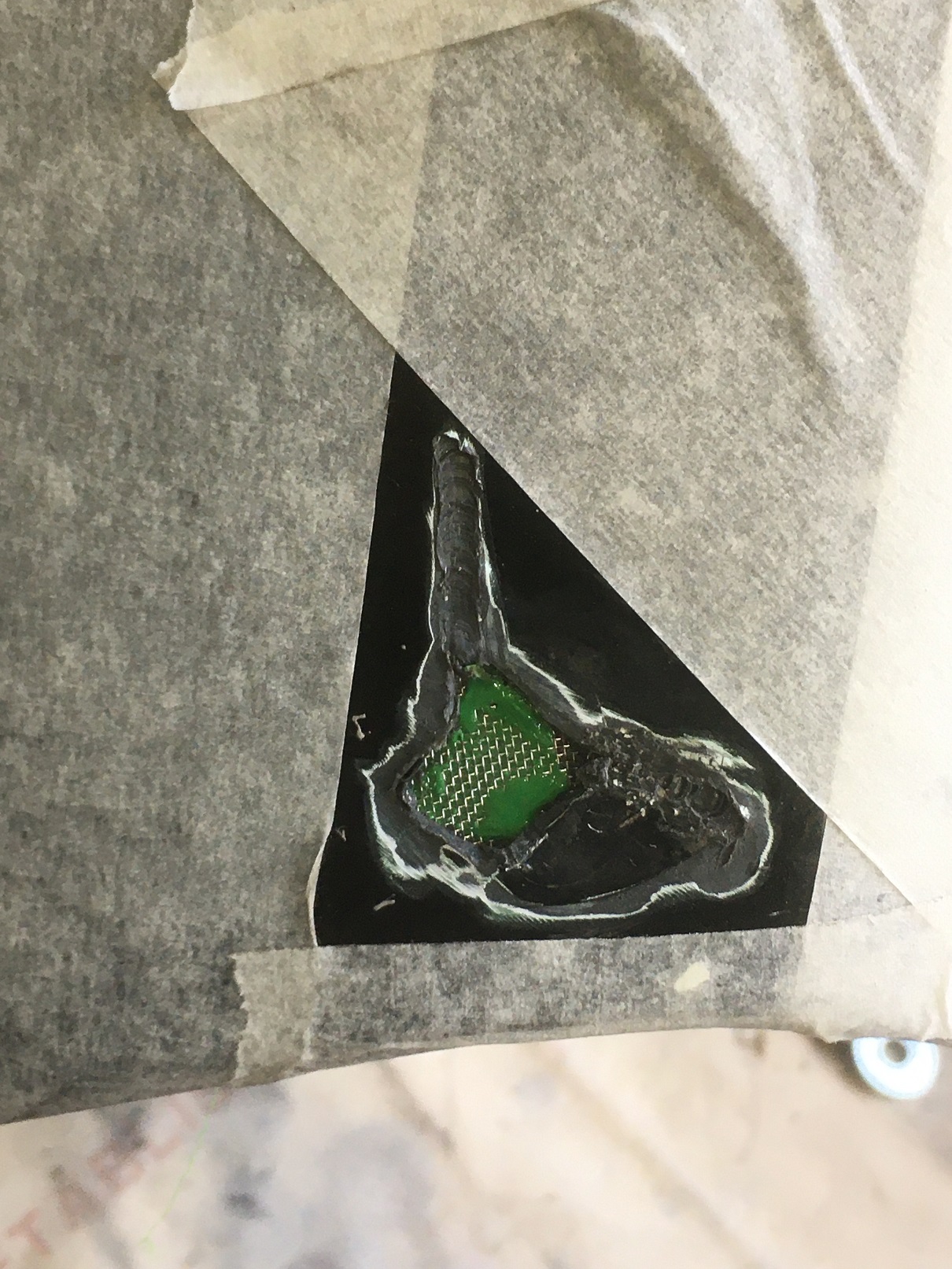 sur la partie visible de la reparation du trou, j 'ai fait un poncage rapide et mis un petit coup de vernis, et ainsi voir comment cela vieillit, en attendant une vrai peinture ;)