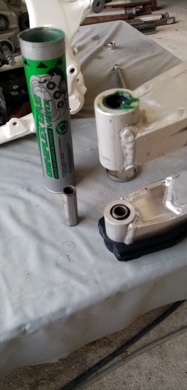 Pour finir , le bras oscillant avec ses roulements graissés et un patin de chaîne neuf .