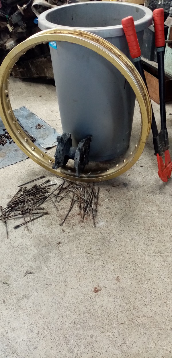 Puis autopsie de la jante avant : cerclage pourri , rayons oxydés. Je coupe tout et refait un coup de propre au moyeu . Un jeu de rayons acier est commandé chez Seurat3. En attente