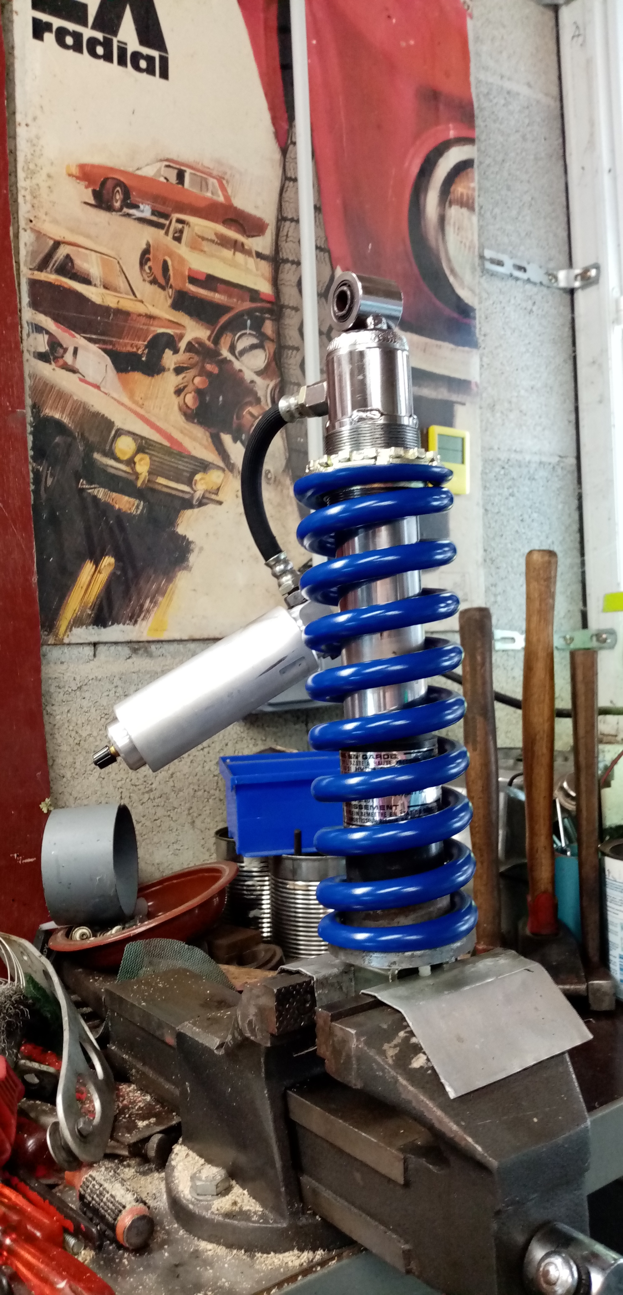 Du côté de l'amortisseur, démontage complet , un jeu de toriques , le joint hydraulique et le segment de piston. J'ai fais tourner un embout de bonbonne qui permet d'inverser le sens de montage de la vessie et recevoir une valve . Le tout est remplie en LHM citron , comme à mon habitude. Le ressort est repeint bleu Marine , raccord avec les soufflets .Touche perso