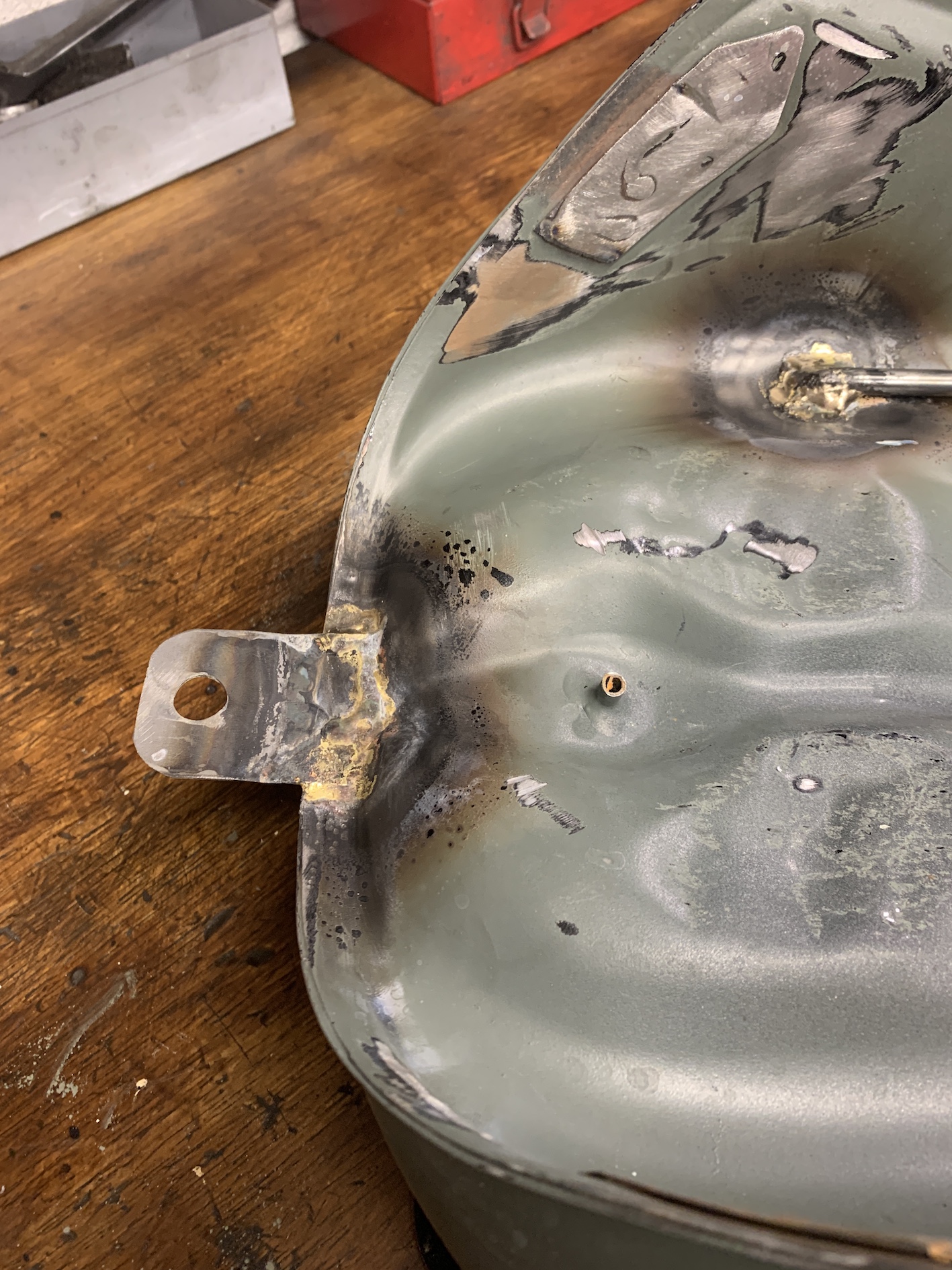 Le réservoir, après préparation, passera en peinture la semaine prochaine. Les trois couleurs Honda transalpines, ça va être très beau (je crois).